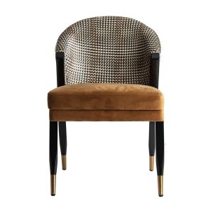 • Silla Brillon de estilo contemporáneo fabricado en terciopelo en color ocre combinado con espuma y madera de caucho.