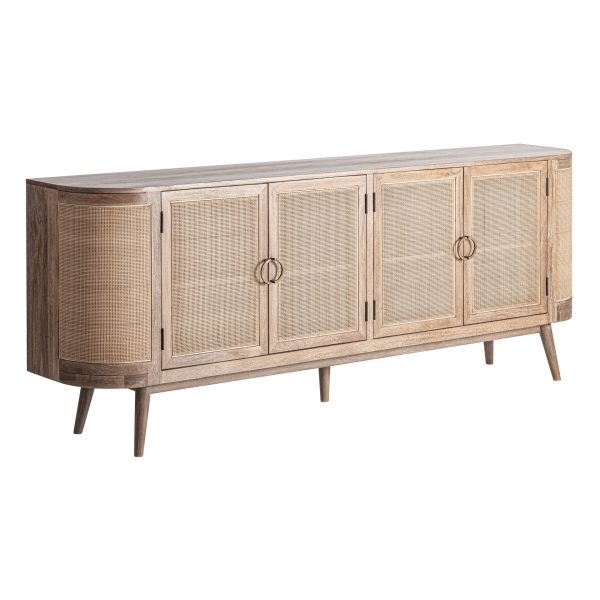 Aparador Beckley de estilo nórdico fabricado en madera de mango en color marrón combinado con ratán en color marrón claro y madera dm. Producto desmontable.