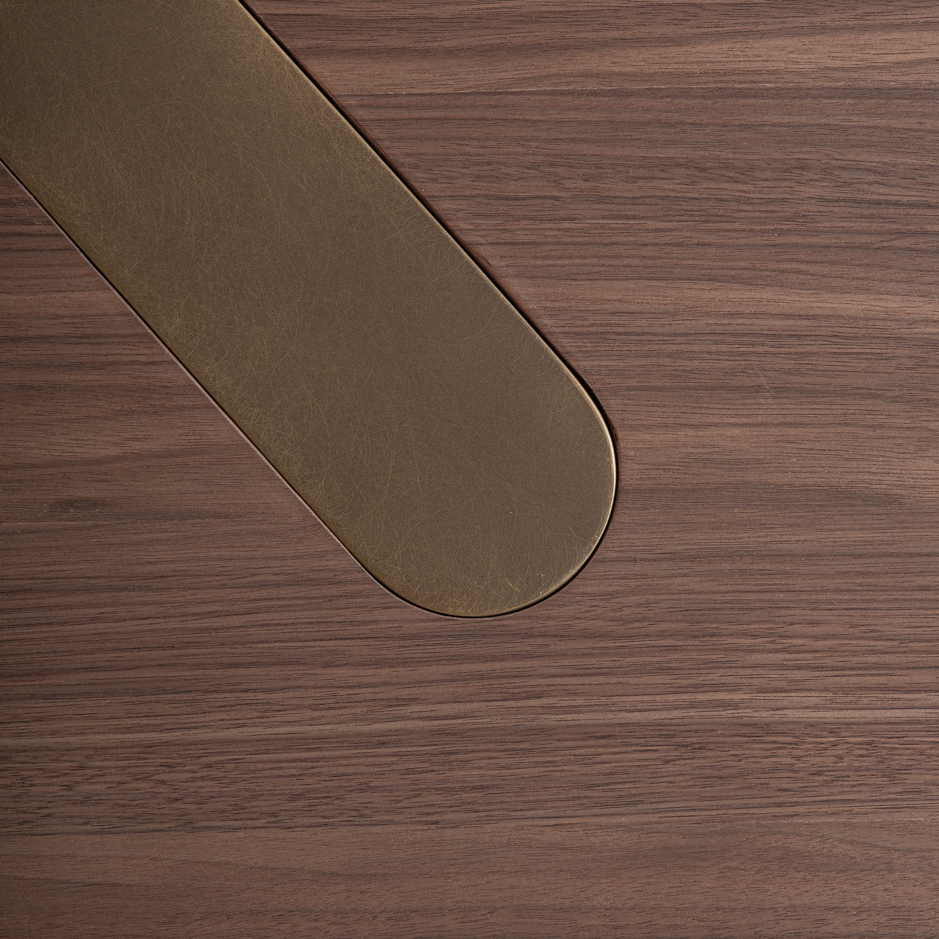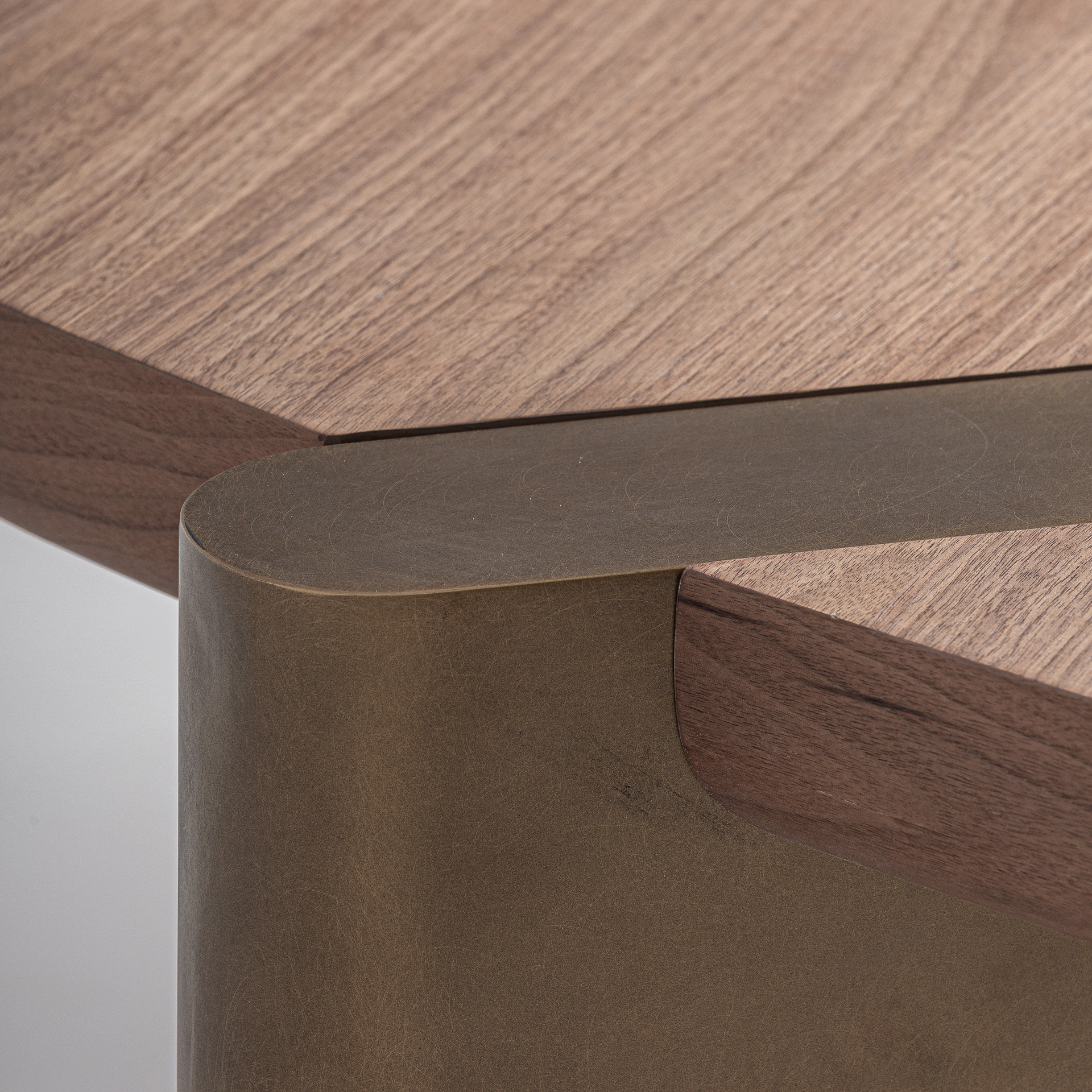 Escritorio Lausana de estilo art deco fabricado en chapa de nogal en color nogal con acabado satinado combinado con madera dm en color marrón con acabado mate y acero inoxidable en color cobre con acabado cepillado. Producto desmontable.