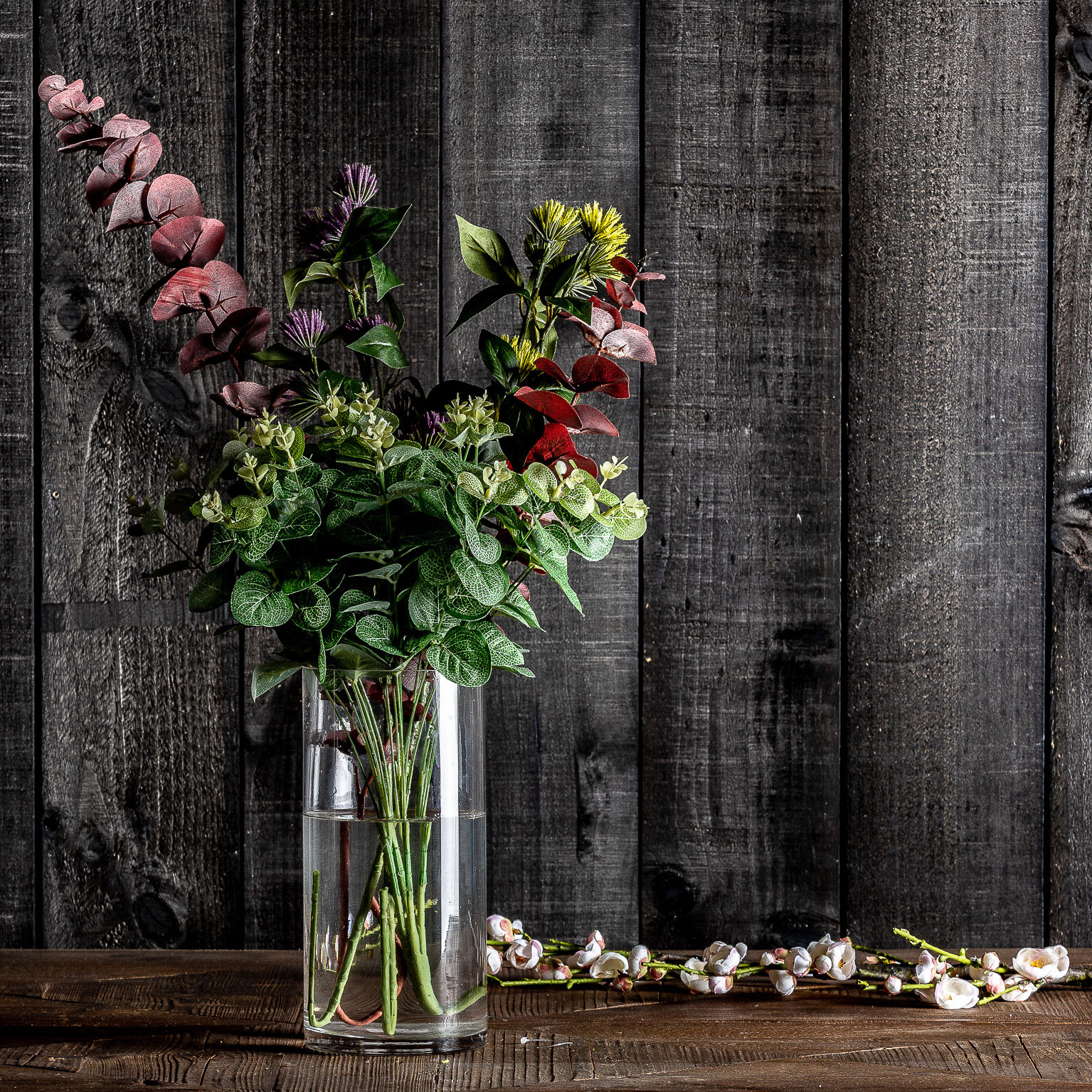 Flor Centaurea de estilo clásico fabricado en plástico en color morado combinado con poliéster en color verde.
