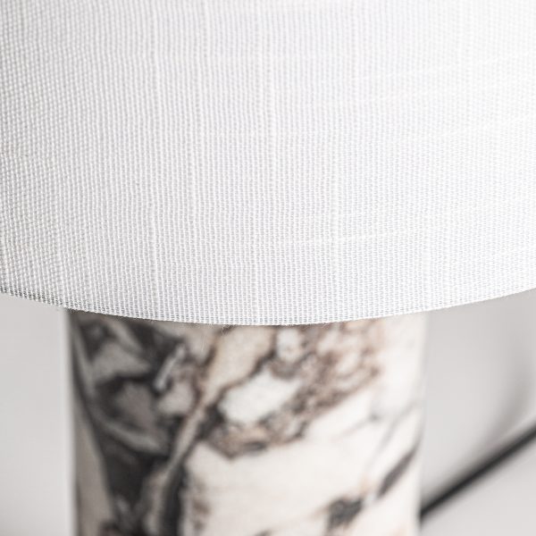 Lámpara de sobremesa de estilo art deco fabricado en mármol en color negro combinado con hierro en color oro con acabado bronce y poliéster en color blanco. Producto desmontable.