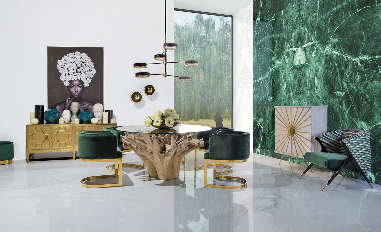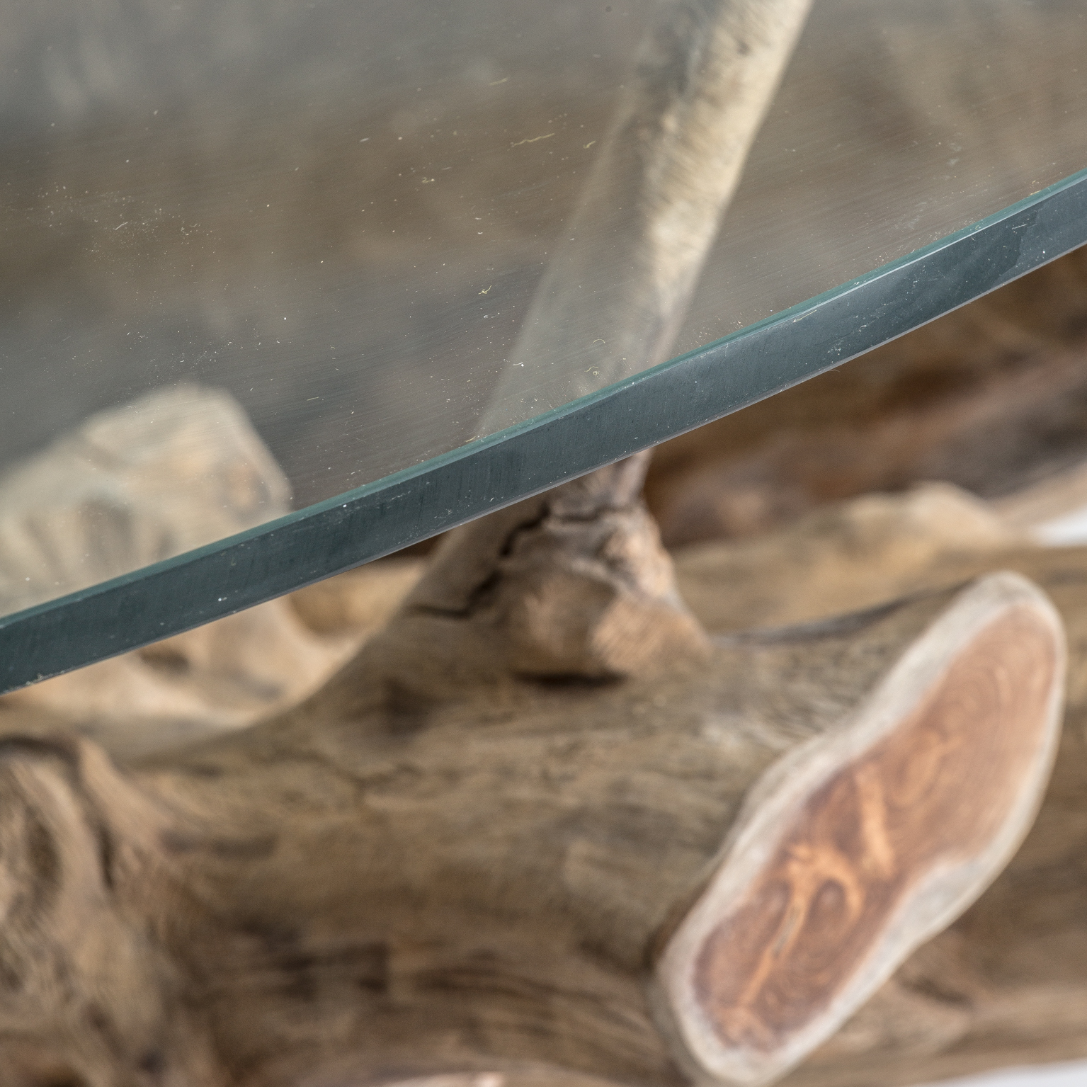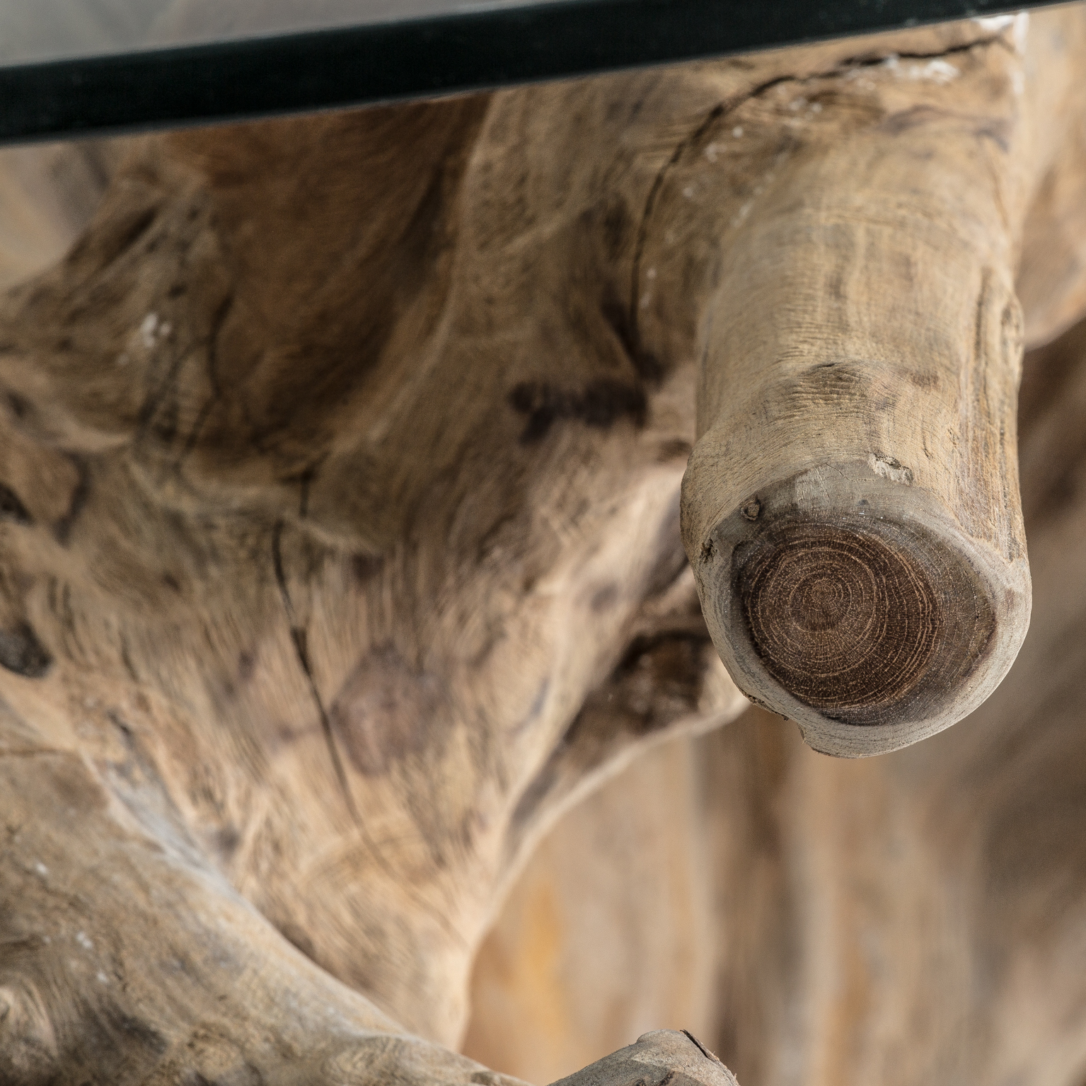 Mesa comedor Warri de estilo étnico fabricado en raíz teka en color marrón con acabado artesanal combinado con vidrio.