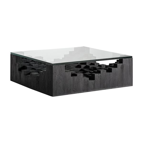 Mesa de centro Pètria de estilo contemporáneo fabricado en madera de mango en color negro con acabado arenado combinado con cristal en color tonos oscuros con acabado templado. Producto desmontable.