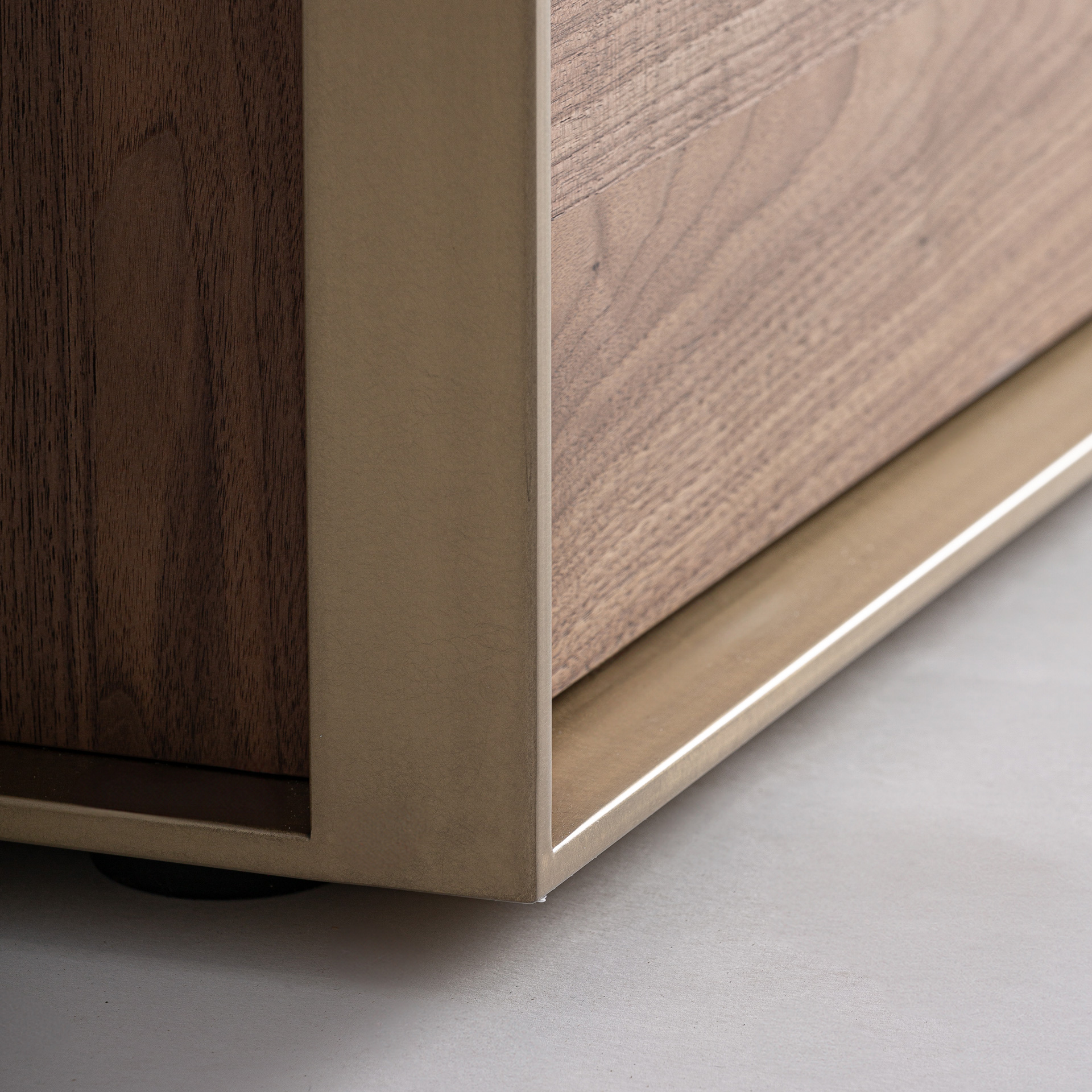 Mueble tv Aisby de estilo contemporáneo fabricado en madera de fresno en color marrón claro combinado con cristal en color marrón con acabado templado y acero inoxidable en color champagne. Producto desmontable.