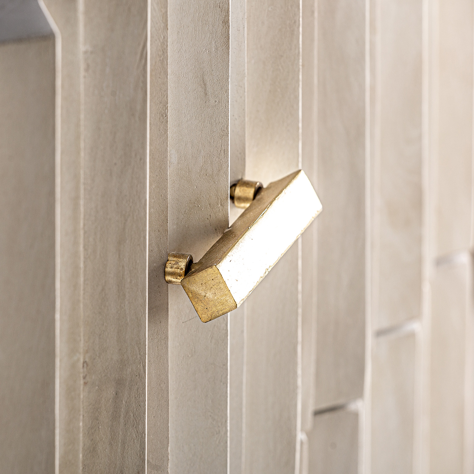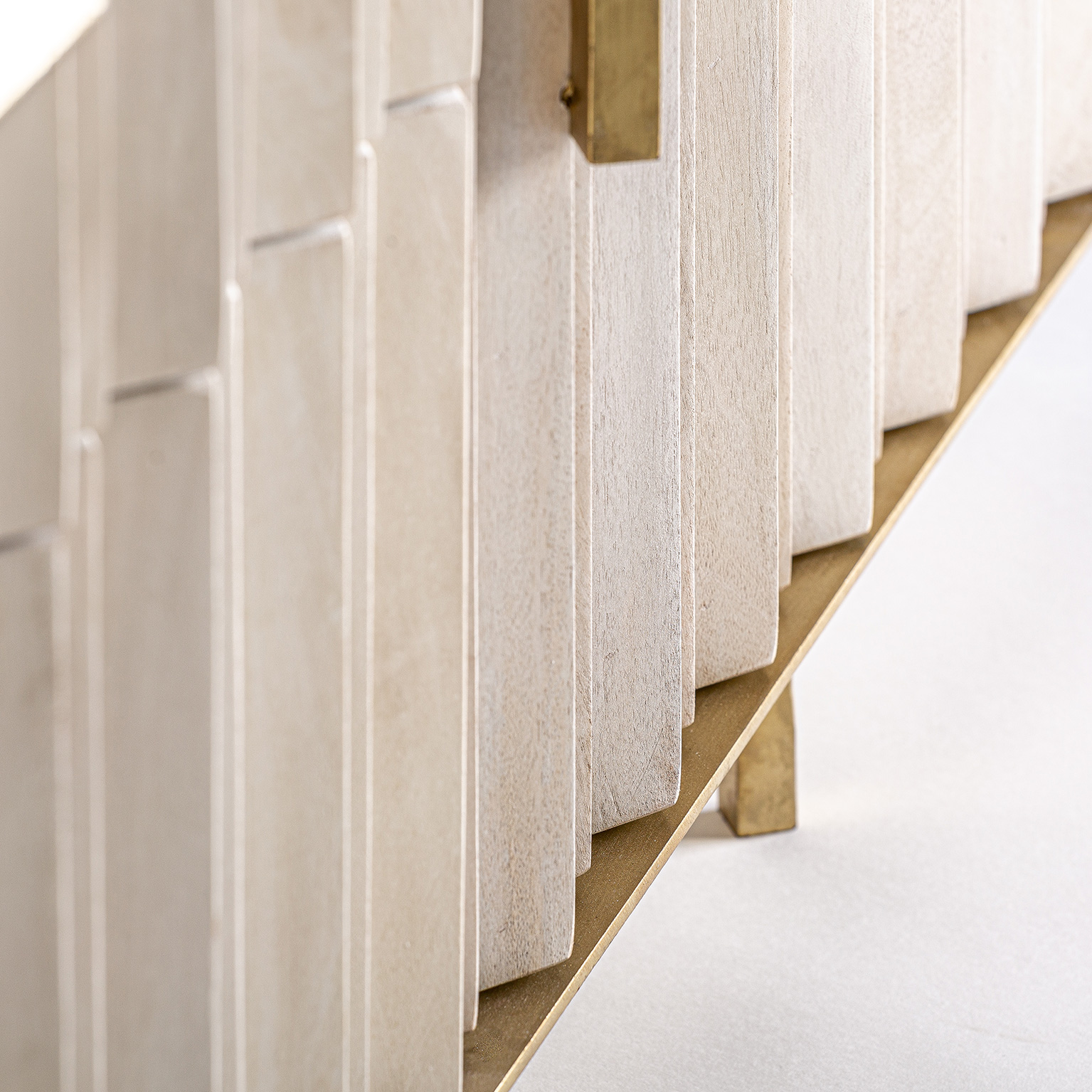 Mueble tv Glees de estilo art deco fabricado en madera de mango en color crema combinado con hierro en color oro.