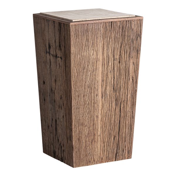 Peana Merkem de estilo rústico fabricado en madera recuperada en color marrón con acabado envejecido combinado con travertino en color beige con acabado satinado.