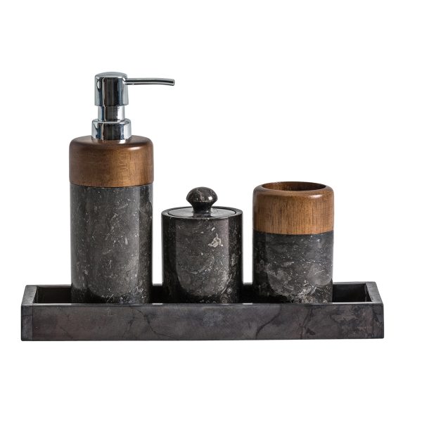 Set de aseo j 4 Neptuno de estilo contemporáneo fabricado en mármol en color negro combinado con madera de ébano en color oro.