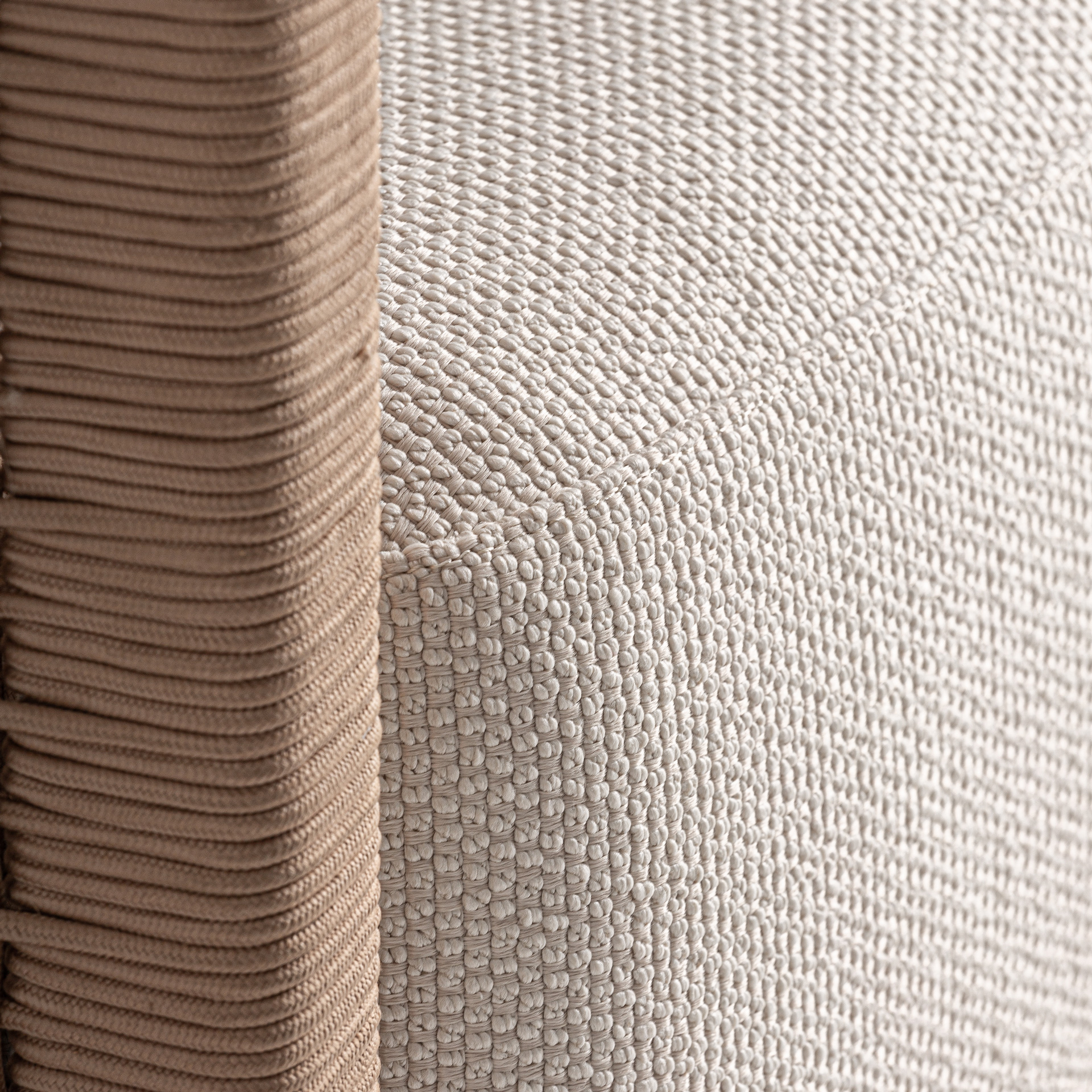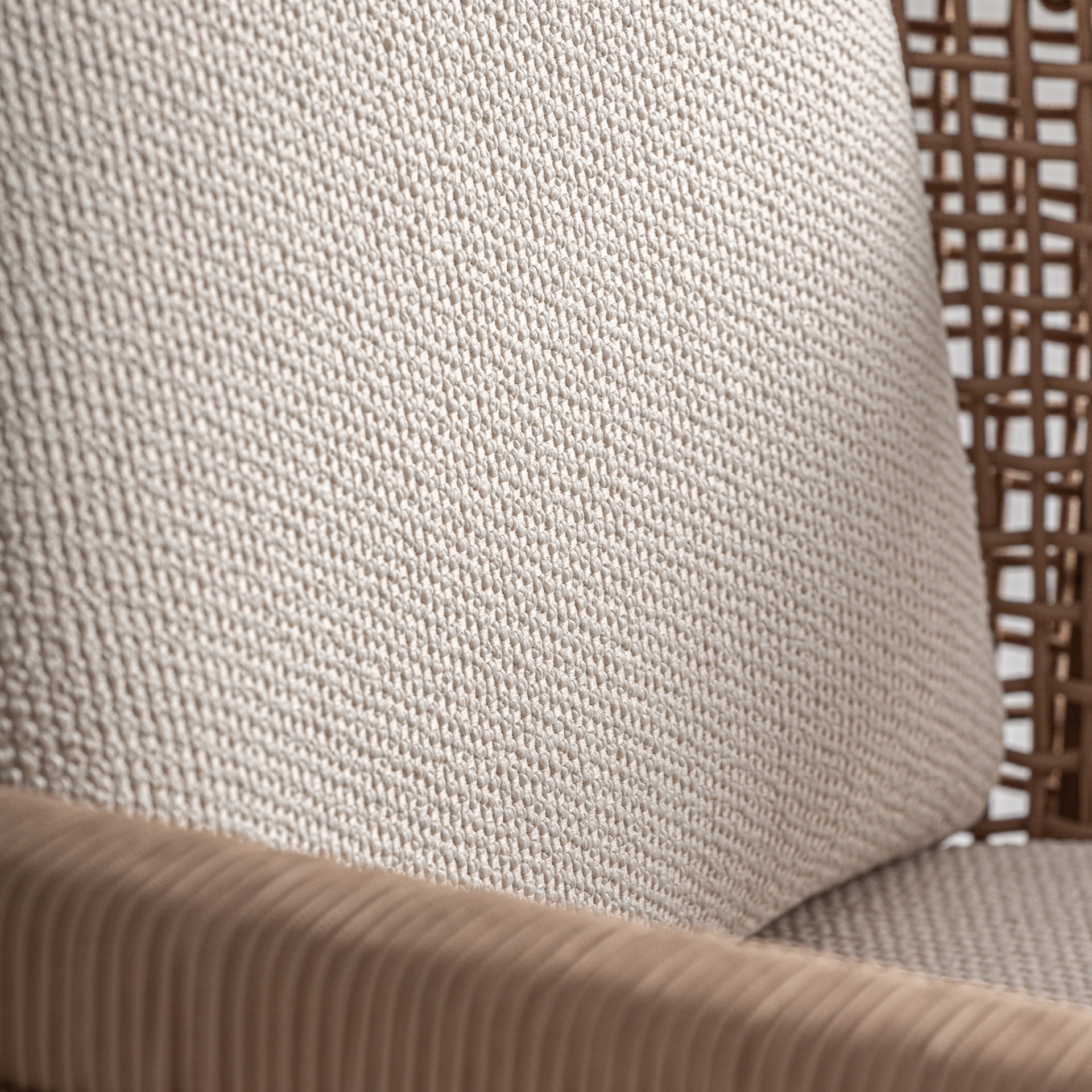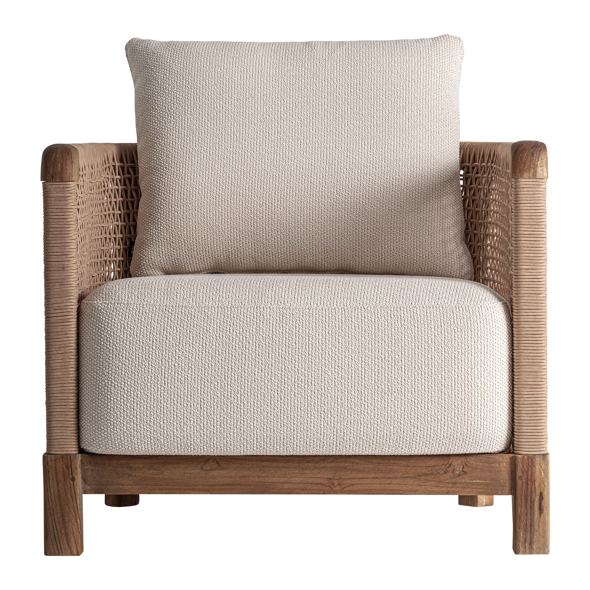Sillón trena de estilo boho fabricado en madera de teka reciclada en color marrón combinado con polipropileno reciclado en color blanco. Producto desmontable.
