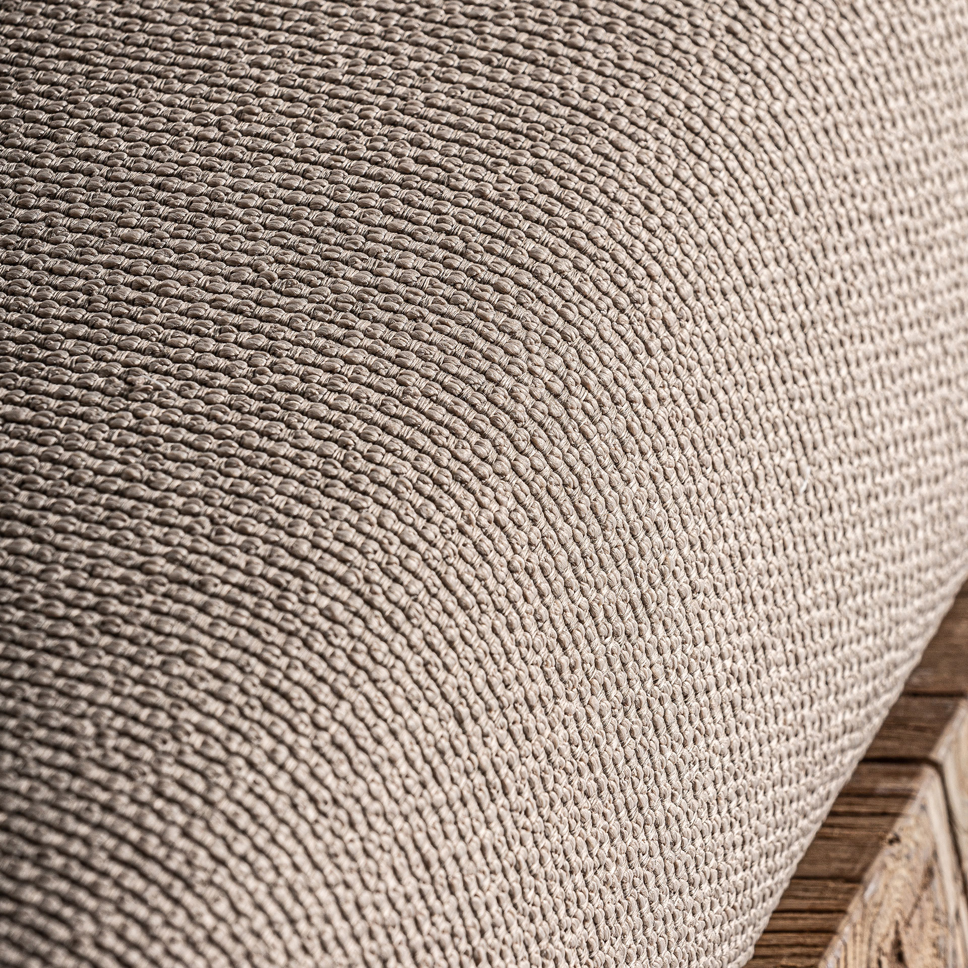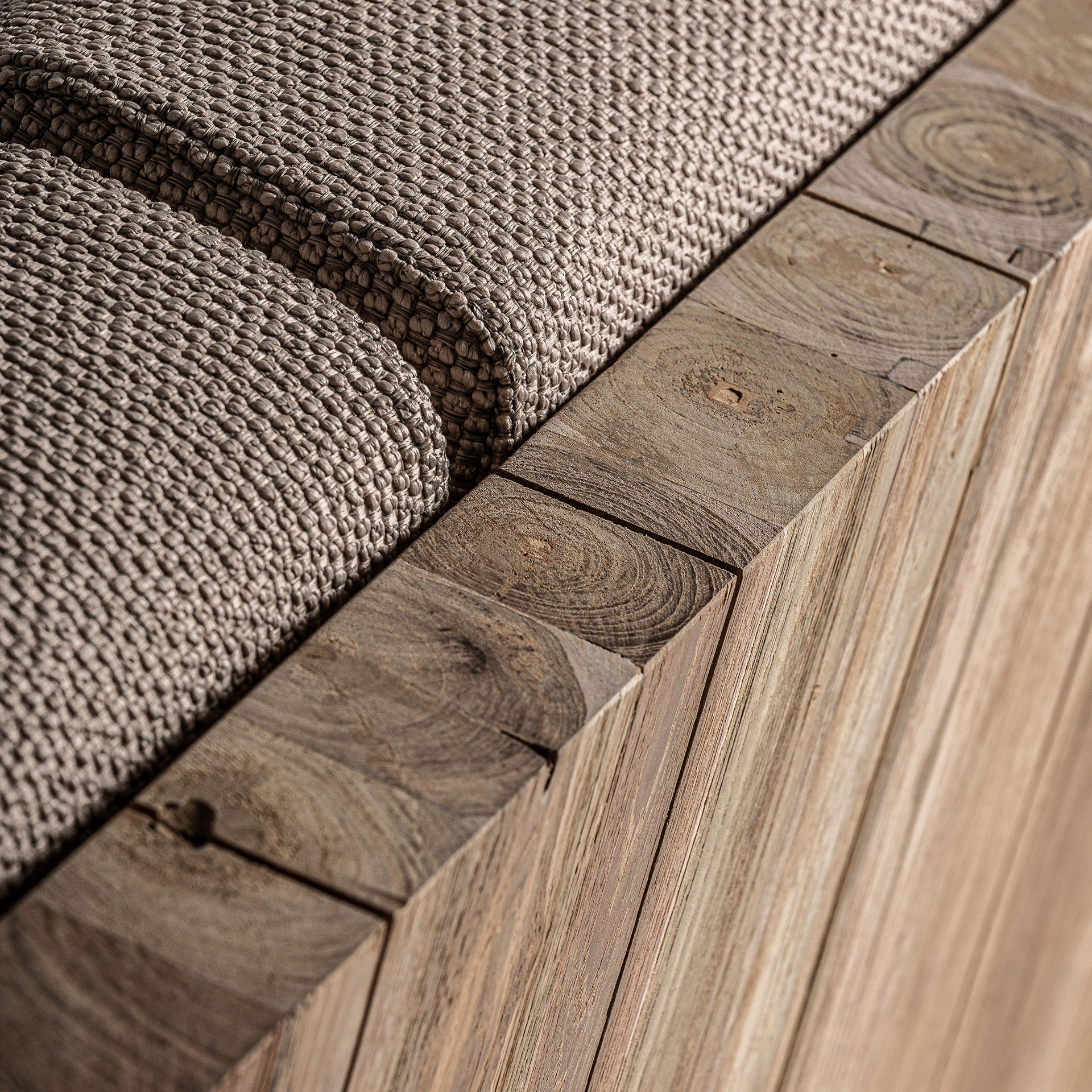 Sofá pure de estilo colonial fabricado en madera de teka reciclada en color marrón con acabado natural combinado con polipropileno reciclado en color beige y espuma. Producto desmontable desenfundable.