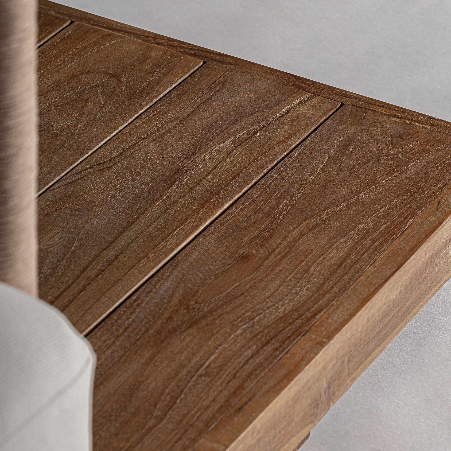Sofá trena de estilo boho fabricado en madera de teka reciclada en color marrón combinado con polipropileno reciclado en color beige. Producto desmontable desenfundable.