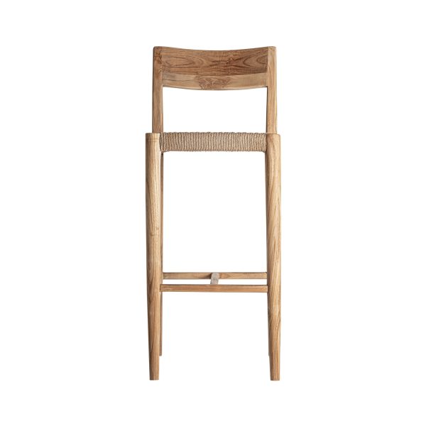 Taburete caen de estilo colonial fabricado en madera de teka en color marrón combinado con fibra natural en color marrón claro.